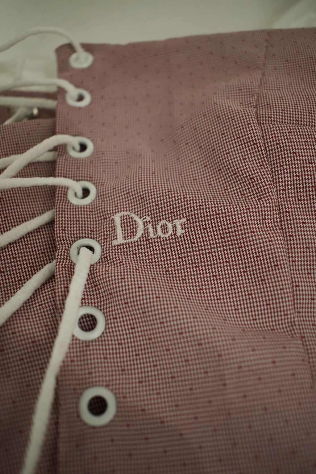 Um corset único feito através de uma camisa da Dior original. Com abertura tanto na frente quanto nas costas em ilhoses, que garante um ajuste perfeito. O modelo veste confortavelmente do PP ao P, combinando sofisticação e versatilidade em uma única peça.